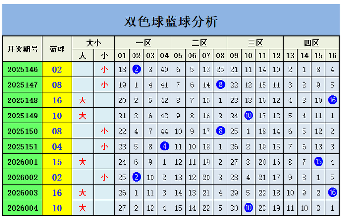 最近10期蓝球开出号码,四区比为:3:2:2:3,上期开出三区号,本期热心二区出号。推选号码:05